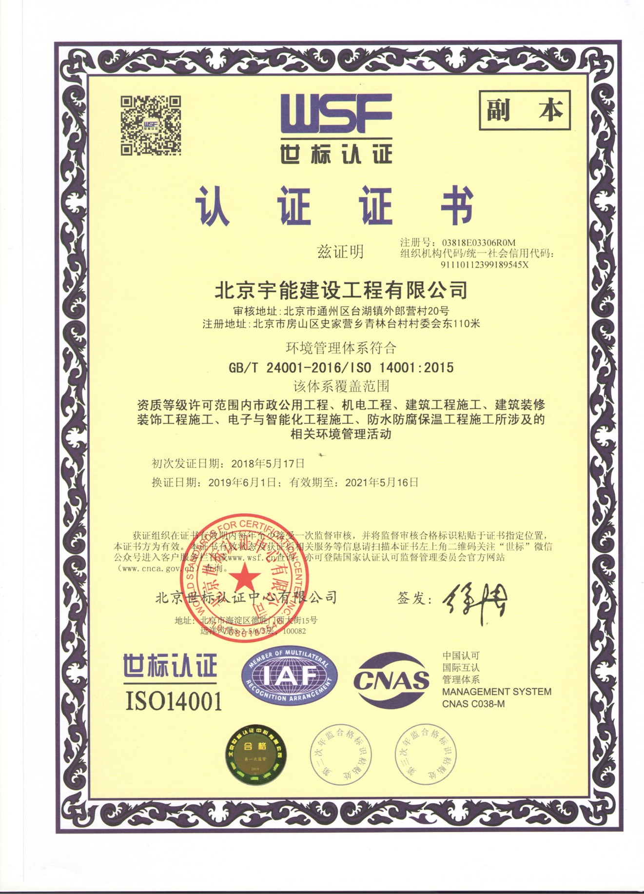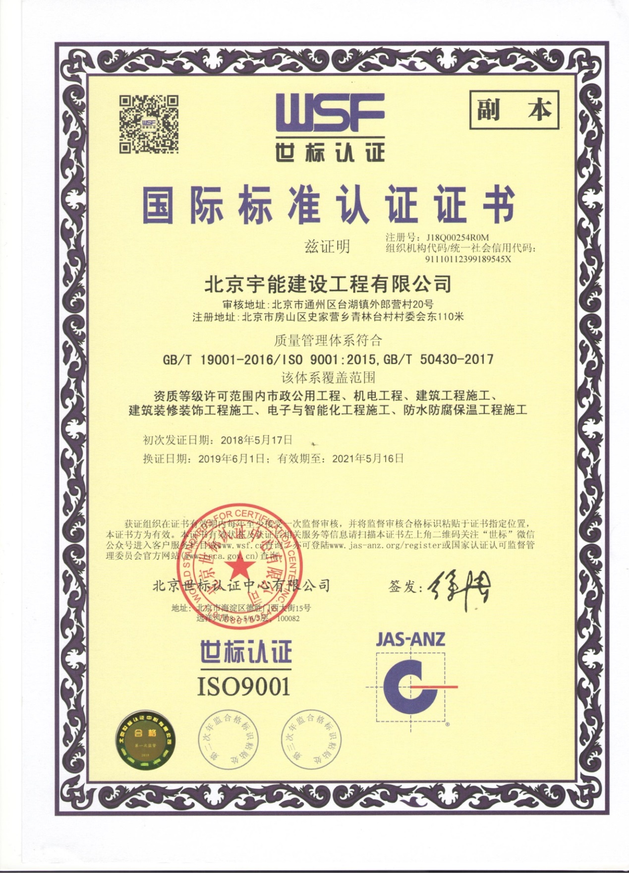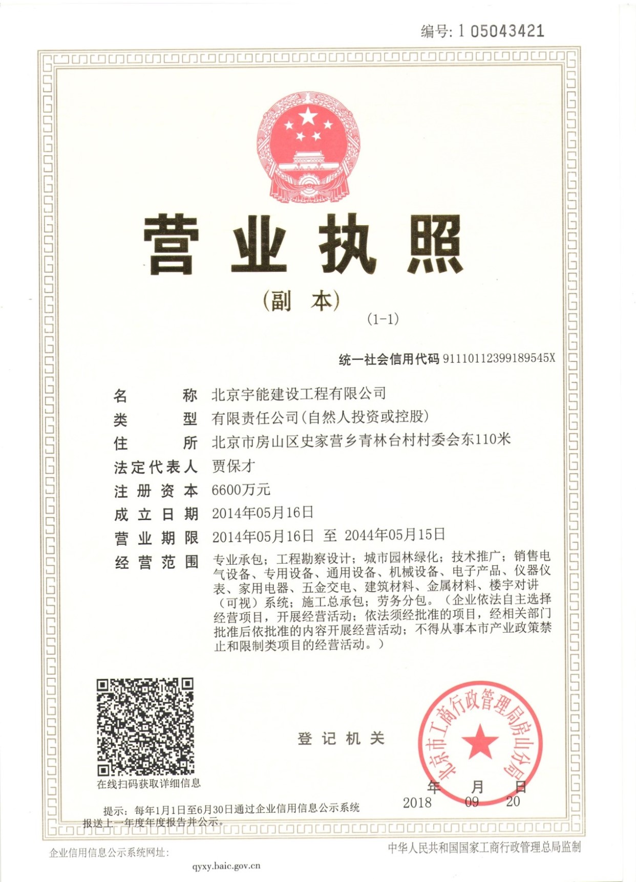 北京宇能建設(shè)工程有限公司成立于2014年5月16日,前身是北京博遠(yuǎn)天宇電力科技有限公司,注冊(cè)資金6600萬(wàn)元。具有《市政公用工程施工總承包叁級(jí)》、《機(jī)電工程施工總承包叁級(jí)》、《建筑工程施工總承包叁級(jí)》、《建筑裝修裝飾工程專業(yè)承包貳級(jí)》、《電子與智能化工程專業(yè)承包貳級(jí)》、《鋼結(jié)構(gòu)工程專業(yè)承包叁級(jí)》、《防水防腐保溫工程專業(yè)承包貳級(jí)》、《建筑幕墻工程專業(yè)承包貳級(jí)》、《模板腳手架資質(zhì)》等;同時(shí)榮獲AAA誠(chéng)信企業(yè)證書、AAA級(jí)誠(chéng)信經(jīng)營(yíng)示范單位、AAA重合同守信用企業(yè)證書、AAA級(jí)企業(yè)資信等級(jí)證書。鑒于公司領(lǐng)導(dǎo)的為人誠(chéng)信,作風(fēng)良好,經(jīng)315全國(guó)征信系統(tǒng)誠(chéng)信企業(yè)認(rèn)證中心頒發(fā)誠(chéng)信企業(yè)家榮譽(yù)證書及誠(chéng)信經(jīng)理人的榮譽(yù)稱號(hào)。